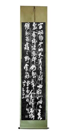 04家中南涧作诗轴 家涧谁登眺天寒草木稀雨余孤岫出日莫众禽依诸郡寇(寇郡)仍紧三年人未归石坛偃卧否处处野棠飞。 家中南涧作 得老亲家正 王铎 约书于乙亥年(明崇祯八年,一六三五年)四十四岁 行书