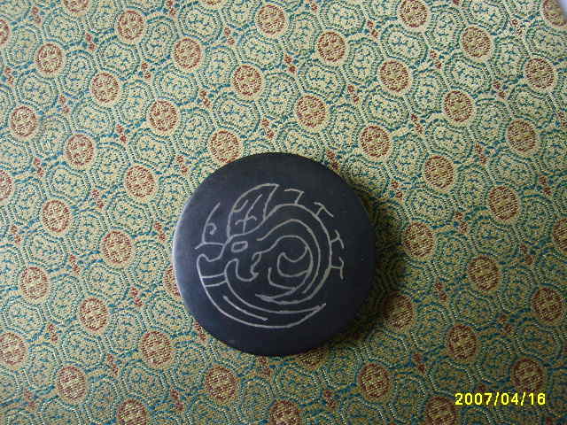 直径5厘米厚近一厘米,黄铜错纯银龙纹,黑漆古作旧,仿战国错银铜器