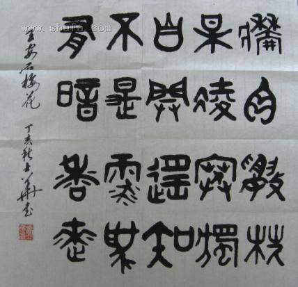 篆书作品。 释文:墙角数枝梅,凌寒独自开。遥知不是雪,唯有暗香来。