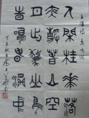 篆书作品。 释文:人闲桂花落,夜静春山空。 月出惊山鸟,时鸣春涧中。