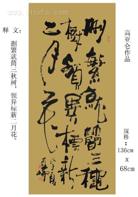 高亚仑简介:号抱清堂主、燕北墨痴、野韵草堂主人、北禅山房老客。香港中华艺术家协会常务理事、中国龙文化研究会副会长、长城魂诗书画家协会顾问、中国古文化艺术研究会学部研究员、河南名家书画艺术研究学会客座教授。书法以楷隶入手,行草见长。擅长巨幅山水。作品多次获国内外大奖,并被国内外友人收藏。07年5月加入世界文化艺术研究中心,任常务理事。07年11月被邀请参加在全国人大常委会礼堂召开的中国世纪大采风当代艺术成就展暨艺术家代表大会。07年全年参赛获奖总数:金奖26次、银奖5次、优秀奖3次、入展奖3次,被授予“2007中国百杰著名画家”、“当代杰出书画艺术家”等称号。08年3月由刘炜华精心绘制、高亚仑卷首题字,“龙腾盛世”15米巨幅长卷分别赠送给时任国家主席胡锦涛总书记和国务院温家宝总理。