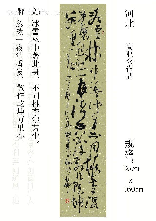 高亚仑个人艺术中心 艺术家 | 学术区 | 搜索区 | 拍卖区 | 视频区 | 交易区 高亚仑简介:号抱清堂主、燕北墨痴、野韵草堂主人、北禅山房老客。香港中华艺术家协会常务理事、中国龙文化研究会副会长、长城魂诗书画家协会顾问、中国古文化艺术研究会学部研究员、河南名家书画艺术研究学会客座教授。书法以楷隶入手,行草见长。擅长巨幅山水。作品多次获国内外大奖,并被国内外友人收藏。07年5月加入世界文化艺术研究中心,任常务理事。07年11月被邀请参加在全国人大常委会礼堂召开的中国世纪大采风当代艺术成就展暨艺术家代表大会。07年全年参赛获奖总数:金奖26次、银奖5次、优秀奖3次、入展奖3次,被授予“2007中国百杰著名画家”、“当代杰出书画艺术家”等称号。08年3月由刘炜华精心绘制、高亚仑卷首题字,“龙腾盛世”15米巨幅长卷分别赠送给时任国家主席胡锦涛总书记和国务院温家宝总理。   邮 址:河北省涞水县野韵草堂书画社(074102) 电 话:0312—4596118