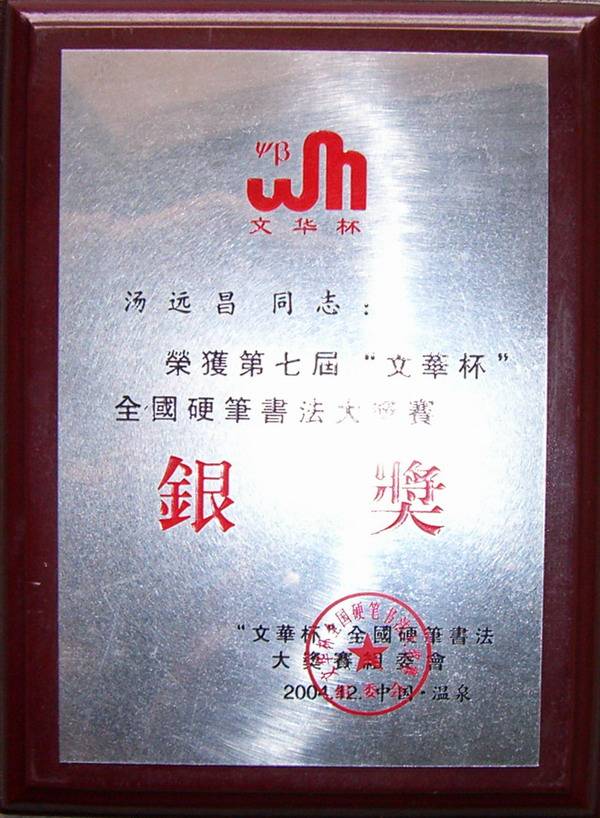 第七届文华杯全国硬笔书法段位大赛奖匾