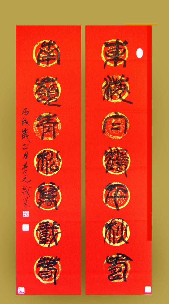 李元茂篆书七言万年红纸寿联,创作于2006年,时年作者62岁。
