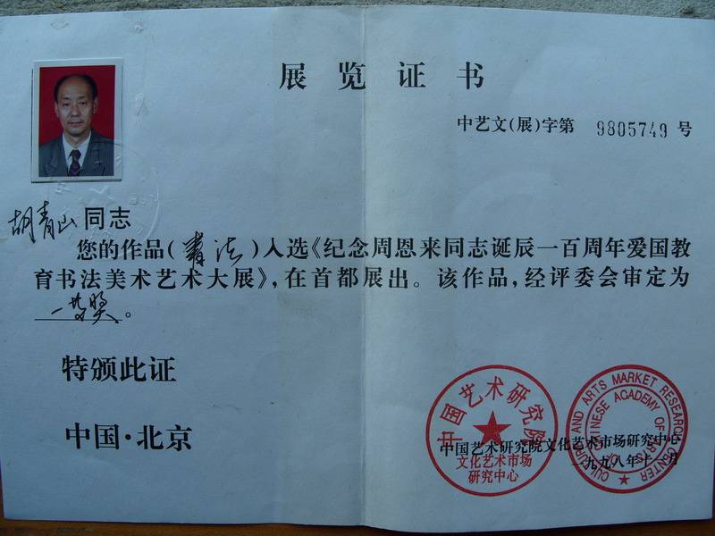 纪念周恩来诞辰一百周年书法一等奖获奖证书