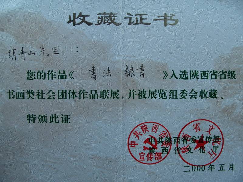 陕西省省级书画作品收藏证书
