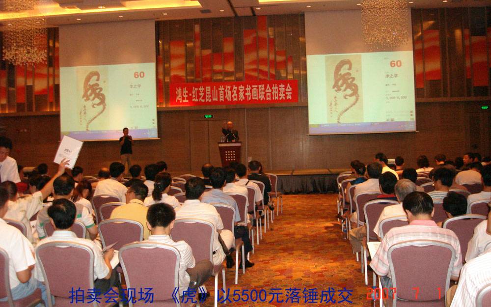 2007年7月1日,''鸿生.红芝''昆山首场名家书画拍卖会,在昆山商贸饭店隆重举行,李之学先生创作的书法作品《虎》,以草书虎字为基准,融合上山虎的形体,栩栩如生,创意新颖,备受书画收藏爱好者喜爱,经多轮竞价,最终以5500元人民币拍卖成交.