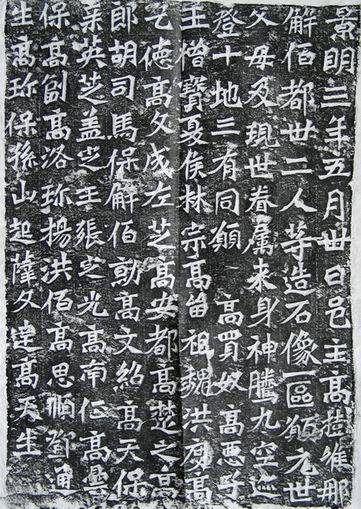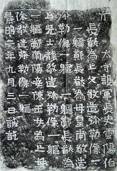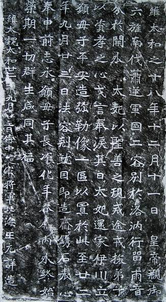 《始平公造像记》本是附属于佛龛的题记,全称为《比丘慧成为亡父始平公造像题记》,北魏孝文帝太和二十二年(498),刻於河南洛阳龙门古阳洞北壁。题记由孟达撰文,朱义章楷书。此碑与其它诸碑不同之处是全碑用阳刻法,逐字界格,为历代石刻所仅见,在造像记中独树一帜。记文内容寄造像者宗教情怀,兼为往生者求福除灾。清乾隆年间始被黄易(1744-1801)发现,受到书坛重视,列入“龙门二十品”,此碑文方笔斩截,笔画折处重顿方勒,结体扁方紧密,点划厚重饱满,锋芒毕露,显得雄峻非凡,被推为魏碑方笔刚健风格的代表。《杨大眼造像记》,刻于北魏景明正始之际(500年-508年)。楷书,刻在洛阳龙门古阳洞。与《始平公造像》、《孙秋生造像》、《魏灵藏造像》并称“龙门四品”。康有为《广艺舟双楫》将其列峻健、丰伟之宗。造像龛位于古阳洞口上方南侧,共六龛,均为圆券形浅龛。分上、中、下三排,每排两龛,其大小不等。圆楣拱内刻卷草葡萄纹,主尊为交脚弥勒(已经残破)。左右二胁侍菩萨侍立。景明二年九月三日(公元501年)完成。《郑长猷造像》, 造像记位于佛龛右侧,高50厘米、宽35厘米,记景明二年郑长为亡父、母皇甫、亡儿士龙以及其妾陈玉女为亡母徐,各造弥勒像。碑文书法有上承汉隶、下启唐楷的重要意义。 《孙秋生造像记》,全称《孙秋生刘起祖二百人等造像记》,在洛阳龙门石窟古阳洞南壁。北魏宣武帝(元恪恪)景明三年(502年)五月廿七日造讫。此碑书犀利刚劲,宽博朴厚,较《始平公造像》笔法多变,龙门二十品之一。孟广达文,萧显庆书。楷书十五行,行三十九字。字体方劲峻拔,沉着劲重。笔法凝练自如。《元详造像记》,全称北海王元详为母子平安造弥勒像记造像记高88厘米,宽42厘米,是元详随北魏孝文帝南伐迁都至洛阳的历史实录。《牛橛造像记》,全称《太和十九年十一月长乐王丘穆陵亮夫人尉迟为亡息牛橛造弥勒像记 》,龙门二十品之一。高100厘米,宽34厘米,是长乐王丘穆陵亮夫人尉迟氏(后改"尉"姓)为亡去的儿子牛橛所造,过去曾有牛橛龛之称。造像碑座中间雕刻莲花一朵,左右二力士抬手作托举状,形象生动逼真。碑文字体端庄整肃。