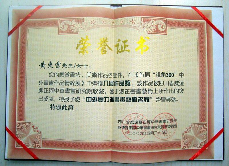 黄东雷 号古画王子2009年4月25日国画和书法作品均在首届“视角360”中外书画作品精萃展中获得“中外实力派书画艺术名家”荣誉证书。