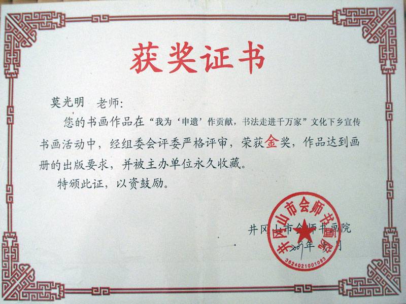 我为申遗做贡献 书法走近千万家 获金奖