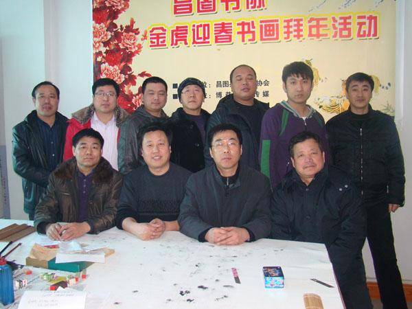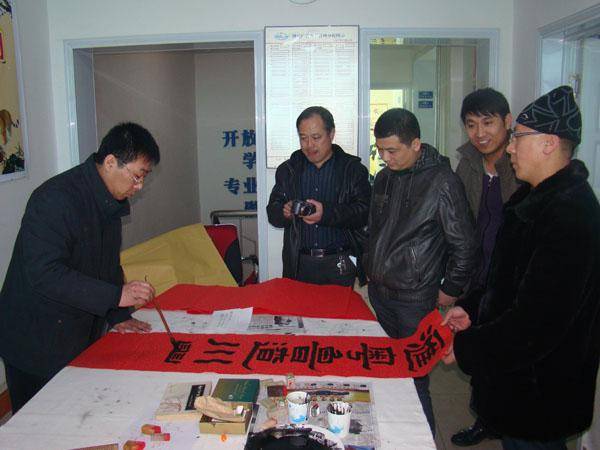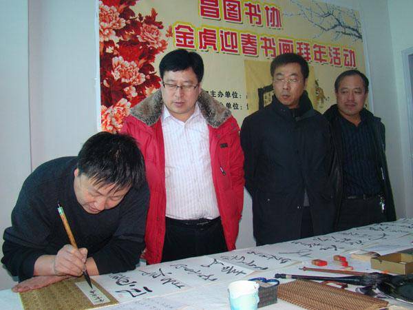 2月10日由昌图县书协主办,由县博益广告信息服务中心承办金虎迎春大拜年活动在博益广告信息服务中心展开,县书协主席郭岩.副主席秘书长张国清等参加了活动。在3个多小时时间里,书法家们挥毫泼墨,为海深种业、新目眼镜、家宝美容美发、汇丰食府等商家送春联及书法作品100余件,同时送上新春的祝福。