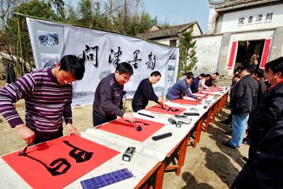 【长江网讯】 (通讯员 吴毅 程书雄)3月18日,新洲区在问津书院举行“问津墨韵”笔会。部分武汉市书法家协会会员及新洲区书法爱好者一共近百人,现场挥毫泼墨,竞献书法作品,以此缅怀先贤孔子,弘扬传统文化,从而拉开即将举行的新洲花朝节专题活动的序幕。十八名作者现场联书,一人书写一个字,18个字风格各异、各显千秋,组成一副对联:问津书院书赋花朝节 、洗笔墨池墨香孔子河,赢得众人一片喝彩。