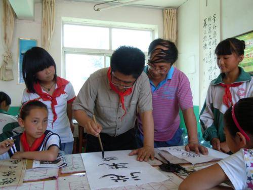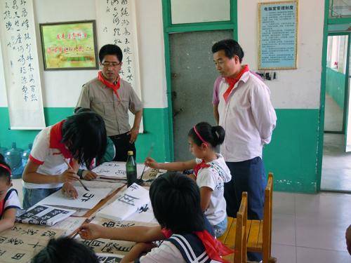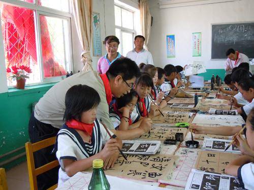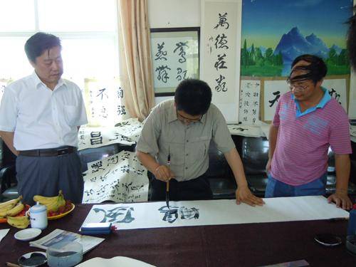 捐赠仪式结束后,市、县书协领导参观了书法教室和小学生的书法作品,手把手的为小学生传授书法技法。随后,王荐主席一行来到佟韦艺术室即兴为学校创作书法作品40余幅,并对佟韦小学的书法特色办学提出了展望。