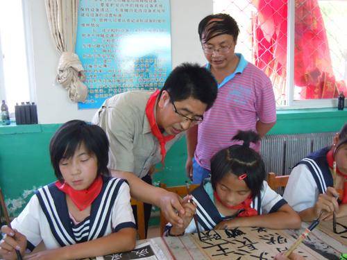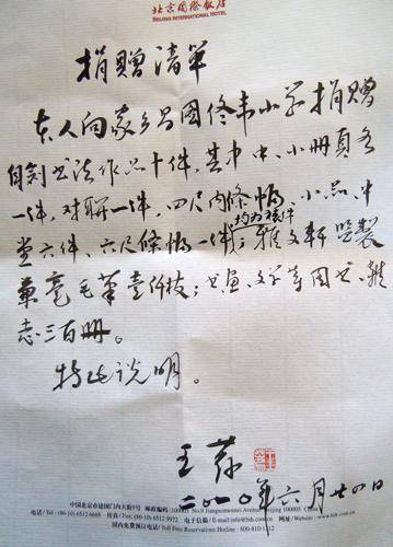 首先,少先队员向来宾敬献红领巾。铁岭市书协会主席王荐先生发表了热情洋溢的讲话,王荐主席就小学生如何正确学习书法知识,提高书写水平进行了系统讲解,并对佟韦小学的书法教育给予了充分肯定,县教育局副局长李俊田为王荐先生颁发了昌图县佟韦小学名誉校长证书。王荐先生向佟韦小学捐赠自创书法作品10件;总价值两万余元的毛笔1000支和图书300册。