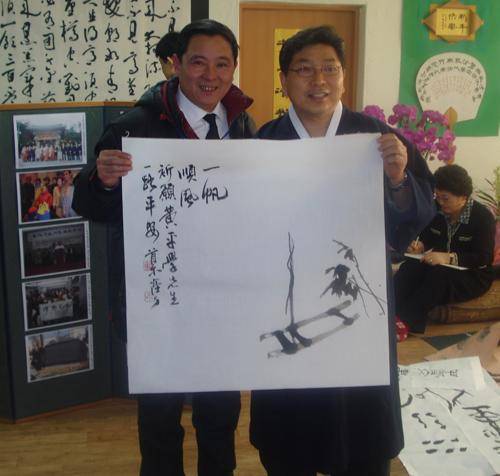 12.2009年1月13日韩国卢源书画院院长权相浩先生向黄平学先生赠送现场创作作品。