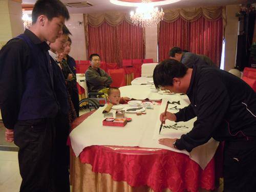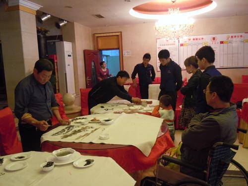 书协主席郭岩讲:感谢单振宇董事长为书画家提供展示书画艺术这一平台,在“两节” 到来之际联合举办这次活动,以此庆祝伟大祖国61周年华诞、欢度中秋佳节是十分有意义的,相信通过这次书画笔会大家一定能创作岀更好的作品来,为我县打造文化产业基地贡献力量。在此也祝汇丰食府全体员工节日愉快,事业兴旺。