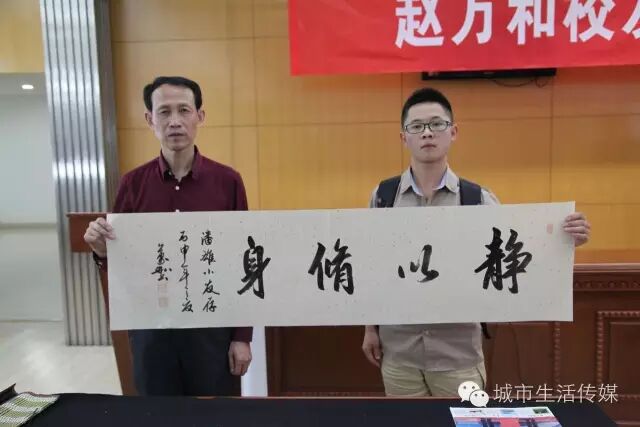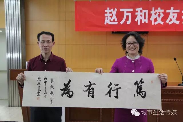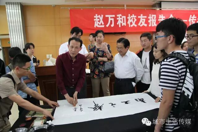 报告会进行到尾声,在众多书法爱好者的簇拥下,赵万和与书法爱好者交流互动,并现场为母校题字,见证校友对母校的情怀,表达对学弟学妹的关心。