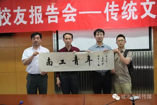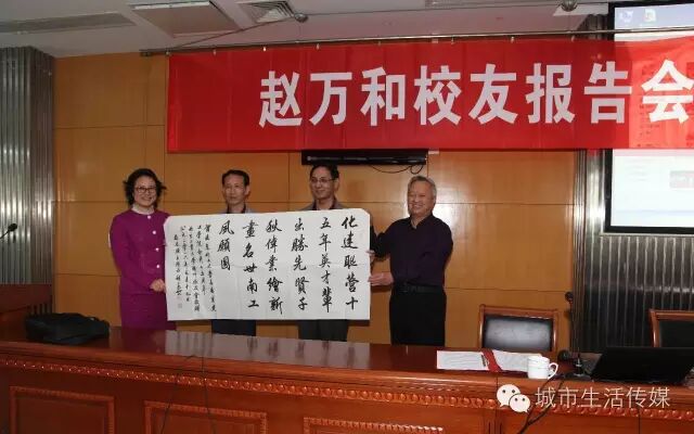 报告会伊始,赵万和代表南京工业大学扬州校友会向母校赠送礼品,以此恭贺母校办学114周年暨南京化工大学与南京建工学院合并组建15周年。