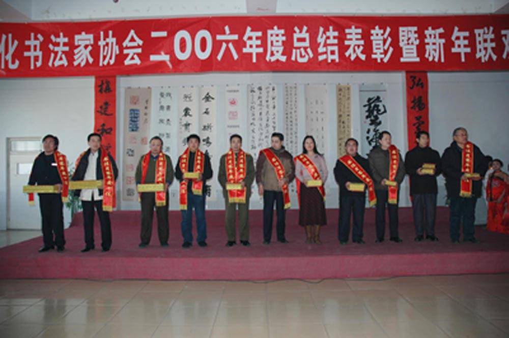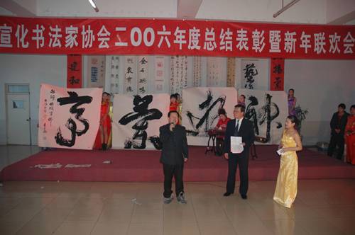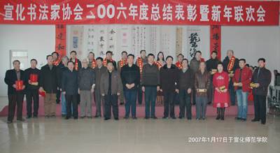 2007年元月17日,宣化书法家协会在张家口教育学院宣化分校音乐教学楼举行了2006年度总结表彰暨新年联欢会,来自市区的各级领导和书法界同仁共计90余人参加了这次表彰会。参加这次活动的领导有:张家口市文学艺术界联合会主席黄建平,我省著名书法家、张家口市书法家协会主席李根茂,区委副书记、区纪检委书记王世光,区人大党组书记、副主任陈一诚,张家口教育学院宣化分校党委副书记、校长田增旺,副校长王万谦。