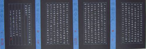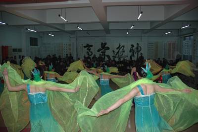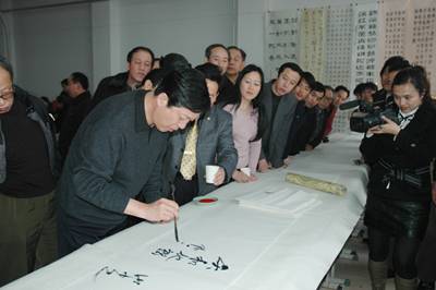 在联欢会上来自书法家协会会员和张家口教育学院宣化分校的师生们各展才艺,为到会领导和嘉宾表演了精彩的文艺节目。白秀华主席现场书写了2米见方的狂草榜书大字 “神游兰亭”,笔法遒劲、大气磅礴,赢得现场阵阵掌声,他将这幅倾心之作敬献给了自己的母校宣师,与此同时也张家口教育学院宣化分校聘请伟客座书法教授,田校长现场为他颁发了聘任证书。李智、张春明、纪文和李鸿峰四位书协副主席和程全祥、程健、花建明、任晓波四位书坛新秀进行了现场配乐书法表演,所书《宣府八景》反映了宣化悠久的历史文化和美丽了自然风光,由于形式新颖,收到在座观众一致称赞,其他会员也都各展才艺,表演了独唱、诗朗诵、男声小合唱等节目。联欢会上,黄建平、李根茂、王世光、陈一诚、田增旺等到会领导和书法同仁们共30余人还挥笔书写了百米长卷,献给长期支持书协工作的宣化供电分公司,以表谢意。