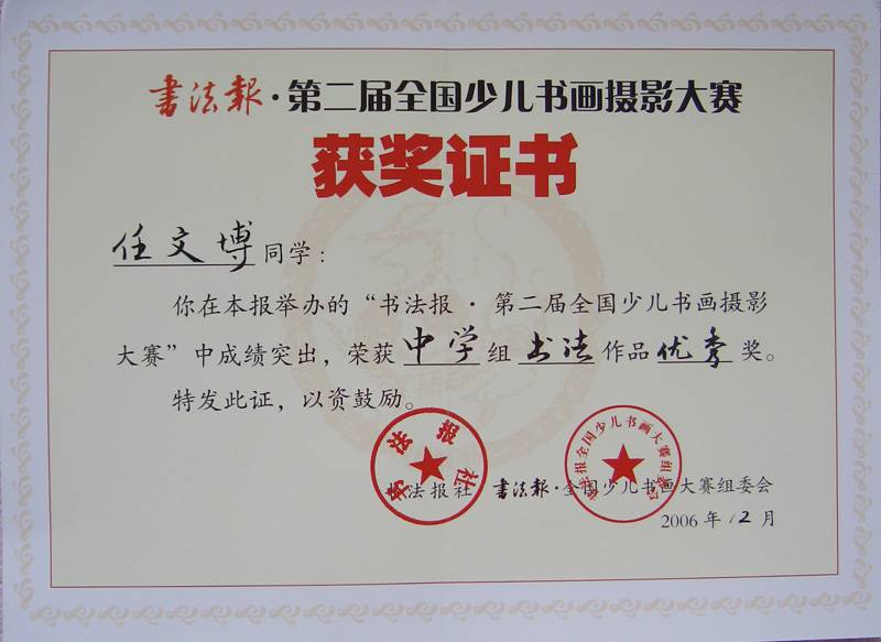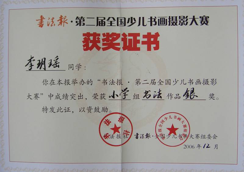 在2006年度“书法报.第二届全国少儿书画摄影大赛”上,硬委会高新区教学基地学员市宝善街小学四年级学生李玥瑶、市五中学生杨文婷成绩优秀,分别获得小学组、中学组书法类银奖,四中学生任文博获中学组书法优秀奖。
