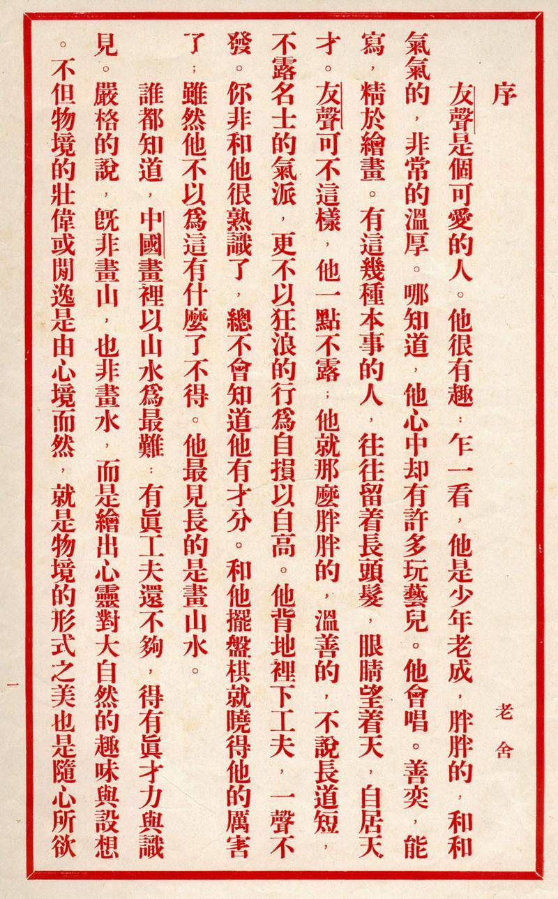 友声是个可爱的人。他很有趣:乍一看,他是少年老成,胖胖的,和和气气的,非常的温厚。哪知道,他心中却有许多玩艺儿。他会唱,善弈,能写,精于绘画。有这几种本事的人,往往留着长头发,眼睛望着天,自居天才。友声可不这样,他一点不露;他就那么胖胖的,温善的,不说长道短,不露名士的气派,更不以狂浪的行为自损以自高。他背地里下功夫,一声不发,你非和他很熟识了,总不会知道他有才分。和他摆盘棋就晓得他的厉害了;虽然他不以为这有什么了不得。他最见长的是画山水。
