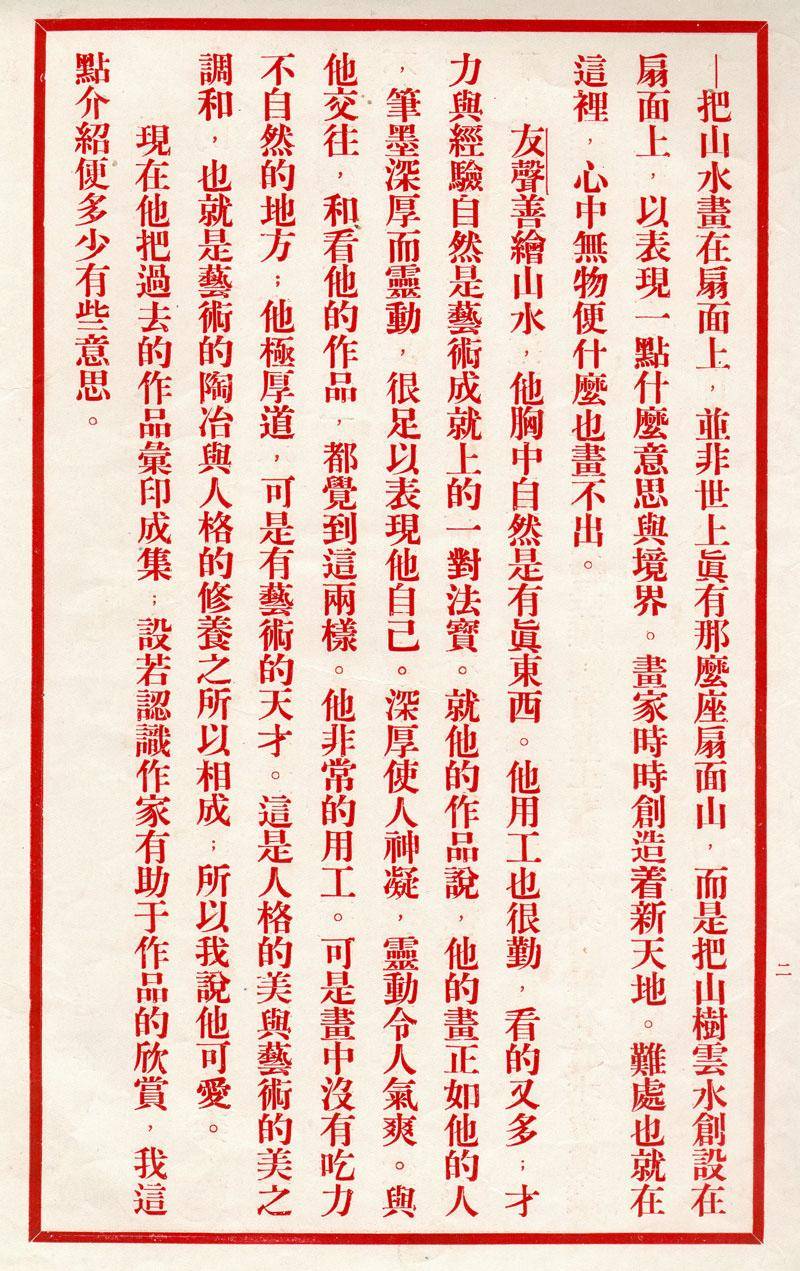 友声善绘山水,他胸中自然是有真东西。他用工也很勤,看的也多,才力与经验自然是艺术成就上的一对法宝。就他的作品说,他的画正如他的人,笔墨深厚而灵动,很足以表现他自己。深厚使人神凝,灵动令人气爽。与他交往,和看他的作品,都觉到这两样。他非常用功。可是画中没有吃力不自然的地方,他极厚道,可是有艺术的天才。这是人格的美与艺术的美之调和,也就是艺术的陶冶与人格的修养之所以相成;所以我说他可爱。