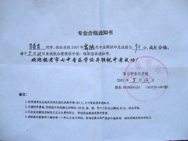 考试分为主专业(60分)、副专业(20分)、音乐素养(10分)、形象气质(10分)四个方面。李春秀同学获得了主专业舞蹈55分、副专业声乐18分、音乐素养8分、形象气质9分,总分90分的高分顺利通过考试,当场获得市七中的预录通知书,获得中考总分降分150分的录取资格。祝贺李春秀同学!