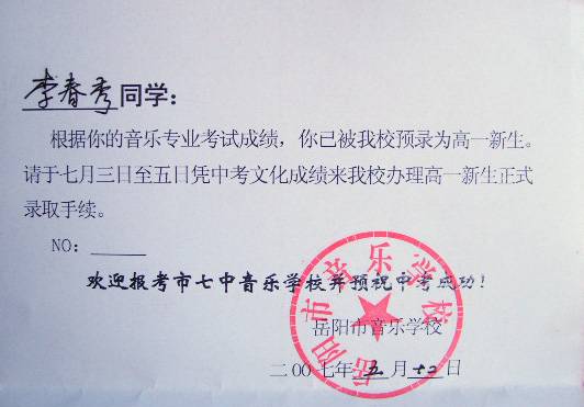 5月12日,在岳阳市音乐学校(市七中)举行的音乐特长生招生考试中,我校中国舞六级班李春秀同学以总分90分的成绩顺利通过考试,被预录为高一新生。