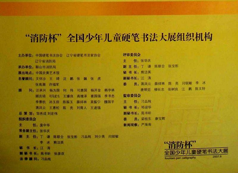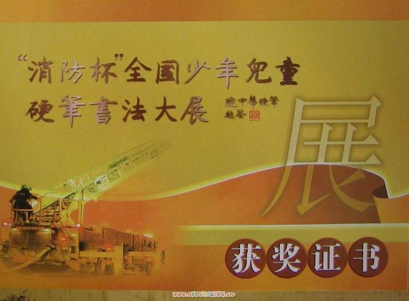 由中国硬笔书法协会和辽宁省消防局共同举办的“消防杯”全国少年儿童硬笔书法大展属公益性消防宣传活动,其目的是通过硬笔书法艺术的平台,宣传消防常识,使消防工作真正走进千家万户。此次大展共收到来自全国各地的参赛作品64万余件。从4月20日起进行初评,第一轮评选出15万件作品,第二轮在15万件作品中评选出1万件,5月12日由来自全国各省市的书法名家组成评审委员会对入选的1万幅作品进行评奖。最终评出精英奖51名,妙品奖66名,佳作奖2081名。