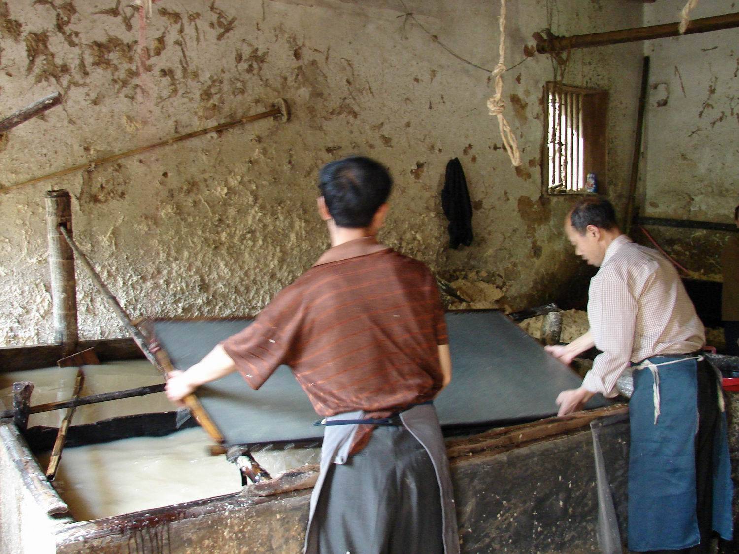 两位师傅在捞纸,这样的动作每天要重复2000多次,非常劳累。纸张厚薄、均匀不均匀靠的就是这两位师傅手上的功夫