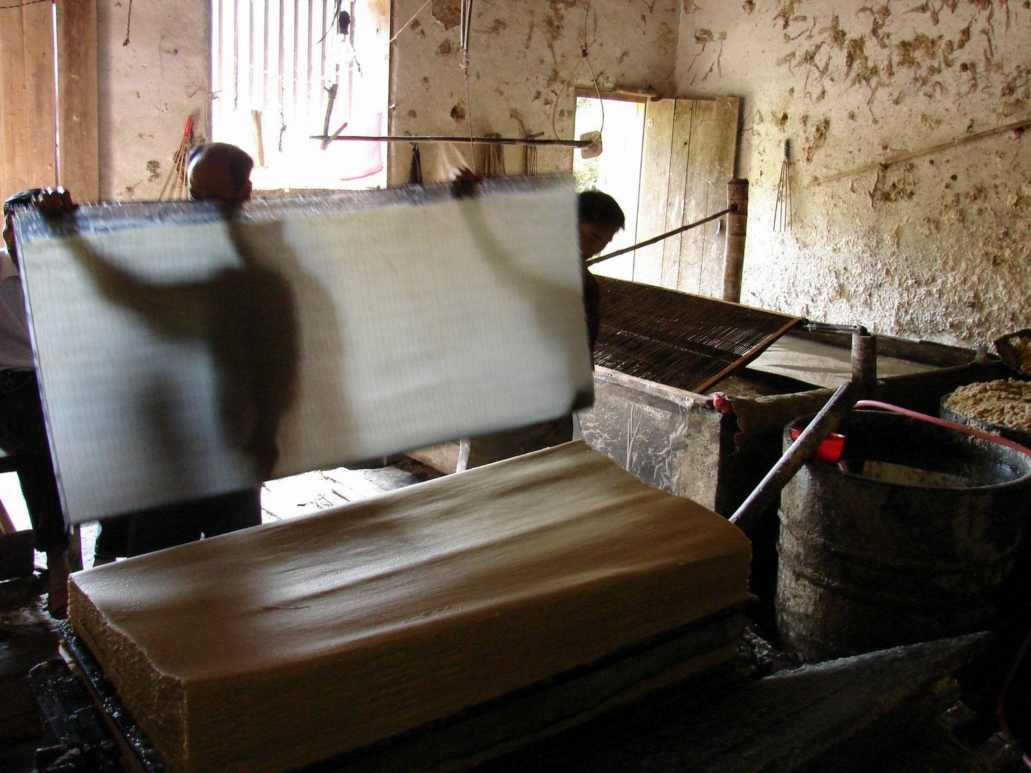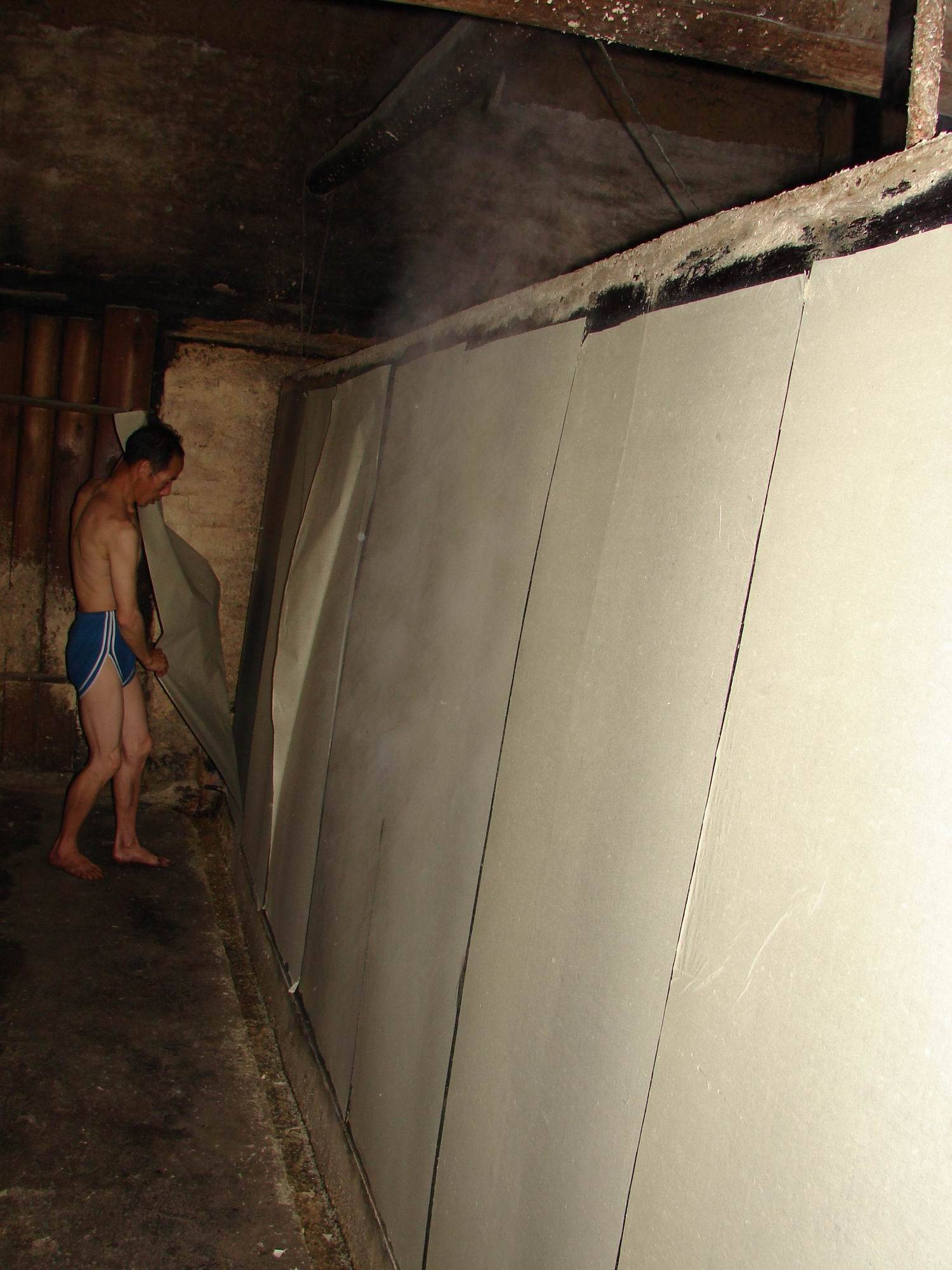烤房里很热,工人师傅经常是打赤膊上阵,捞纸师傅一天捞多少,这里就要烤多少