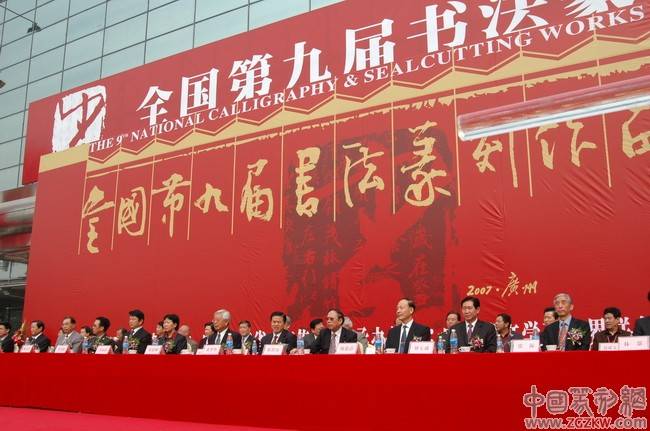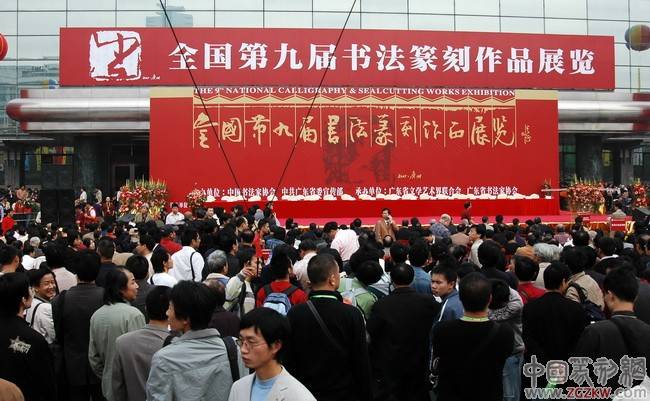 十二月的南国羊城,依然花团锦簇,洋溢着春天的气息。由中国书法家协会、中共广东省委宣传部主办,广东省文学艺术界联合会、广东省书法家协会承办的全国第九届书法篆刻作品展览,于2007年12月18日上午在广东省广州市中国进出口商品交易会流花展览馆开幕。展览馆内外,彩旗飘扬,军乐嘹亮,龙狮舞动,形成宏大的文化场景,热烈的节日气氛。来自全国各地数万名书法家、书法爱好者们都为这一期盼已久的书坛盛典沉醉和欢呼!