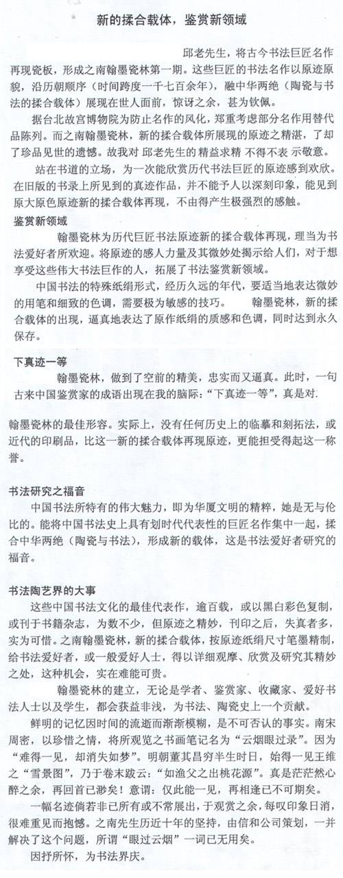 书法翰墨瓷林,做到了空前的精美,忠实而又逼真。此时,·古来中国鉴赏家的成语出现在我的脑际:“下真迹一等”,真是对;翰墨瓷林的最佳形容。实际上,没有任何历史上的临摹和刻拓法近代的印刷品,比这一新的揉合载体再现原迹,更能担受得起这书法研究之福音