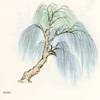 ( 五 ) 柳树画法 古人常说: 画人难画手,画树难画柳,一画便出丑。柳树 体态妩媚,有向水边倾斜的特徵,柳干苍老而柳条柔嫩。画柳 条要微带粗细,不露锋芒,笔缓势连,柔中带刚,如点柳叶, 要蓬松富有变化。