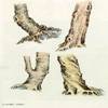 ( 二 ) 树皮,树根 树的面貌, 个性和特徵有时可以从树皮的纹理分辨出来, 每一种树皮都有不同的纹理组织,如松树皮呈鳞状纹,柳树皮 成斜裂人字纹,樱急杏的树皮成横纹,博树皮呈扭曲纹,尚有 许多难以用文字形容的纹理,在写生之前需仔细观察。画树干 时,除了注意树皮的纹理之外,尚需画出立体的感觉,皴树皮 时靠近两侧的纹理要密窄,( 或墨较浓 ),靠近树中央的纹理 可疏阔 ( 或墨较淡 ),这样就合乎透视的原理. 画完枝干以後即画根部,至於画不画树根可依土石的多寡 或树的种赖类而定,通常石多土少的情型,以露跟居多; 土多 石少的情形,则以藏根居多,又如榕树多露根。然而画的时候 也可以不计土石的分野,依画面的需要而决定藏根或露根,但 要画出从土中崛起, 坚韧稳固的特性,不可画成如插在土面, 一推即倒的感觉。