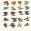 ( 三 ) 树叶 树叶的排列法与结构亦因种类而异,不管画哪一种树,先 要近看了解叶的形状与排列原则,再远看整体的姿态与感觉。 下图的十二种树叶是台湾常见的。大自然的数木是最佳的画谱 ,变化多端,让我们画之不尽,平时应多做观察,勤加写生。 古人画树以夹叶 ( 勾叶法 ) 首先被广泛的使用,将每一 片叶子用两笔以上的线勾出後再填上色彩。水墨兴盛後,夹叶 渐少,单叶 ( 点叶法 ) 逐渐增多,简化以一笔象徵一片或一 组叶子,并依其形状有胡椒点、字点、介字点、梅花点、鼠足 点、垂藤点、松叶点、竹叶点、…。等许多不同的符号, 然 而这些符号都是前人从自然的观察里提炼而成,既概括又写实 ,并非凭空捏造。除了松、竹、柳、梧、等具有鲜明形象特点 的叶子外,其他特徵不甚明显者,通称为杂树。点叶时需注意 树顶受阳光叶子较多,靠树干处叶子通常较稀疏。