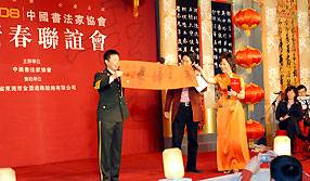 2008年1月24日晚,中央电视台北京梅地亚中心演播厅内,灯火辉煌,高朋满座,欢歌雅乐,琴韵墨香。由中国书协主办,广东东莞长安镇东莞金盟道路设施有限公司支持的中国书法家协会2008年新春联谊会在此隆重举行。全国人大、全国政协,中宣部、中国文联等领导,著名文艺家、各界嘉宾,中国书协主席团成员、团体会员代表、在京中国书协理事、书法家以及首都各界友好人士等近300余人,欢聚一堂,共祝2008年新春的到来。
