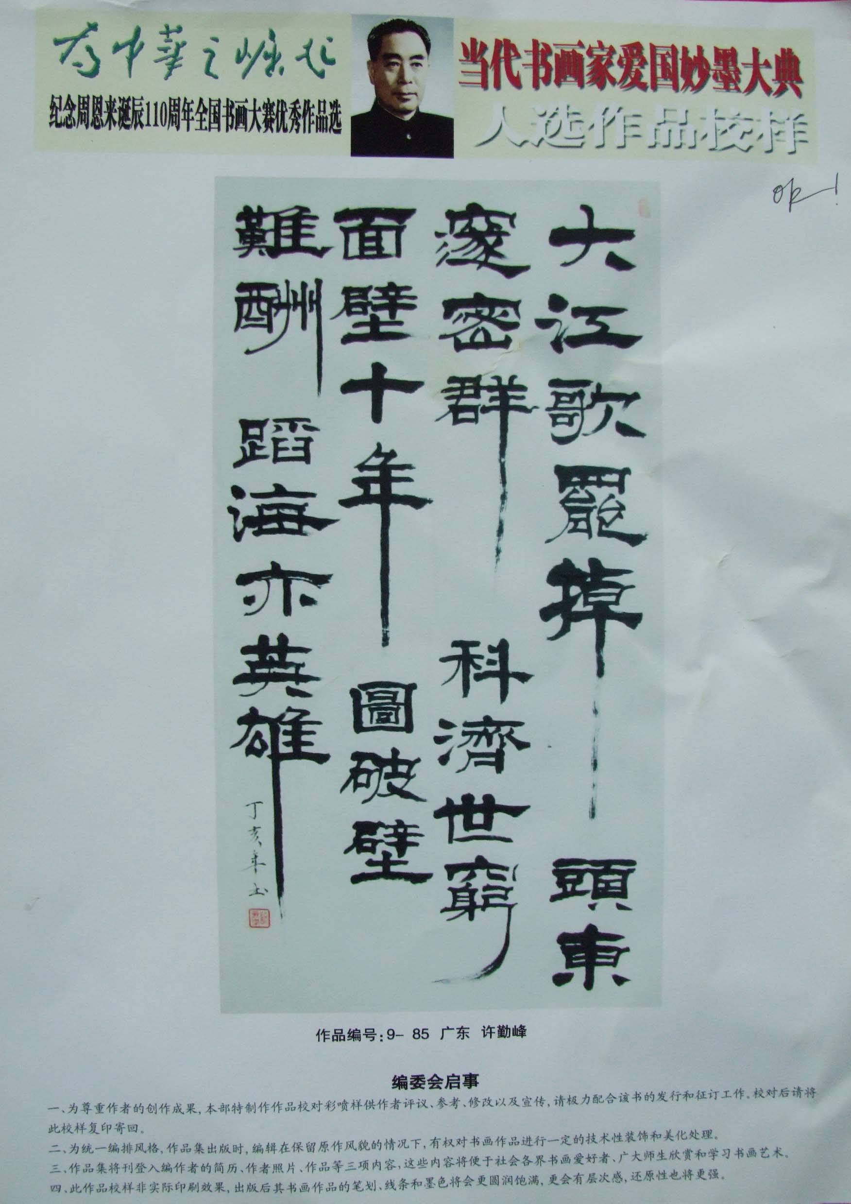 许勤峰作品《大江歌罢》在参加周恩来诞辰110周年全国书画大賽中作品入选校样。