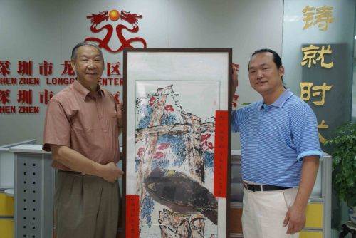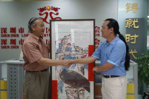 2008年7月18日在龙企两会成立三周年来临之际,应龙企两会之邀,中国湖社书画出版社社长王和平先生一行到会商谈庆典画展工作.图为龙企两会顾问、中国湖社书画出版社社长王和平先生向龙企两会赠送国画,左为原龙岗区人大常委会主任、现龙企两会会长廖寿伦先生接受礼物。