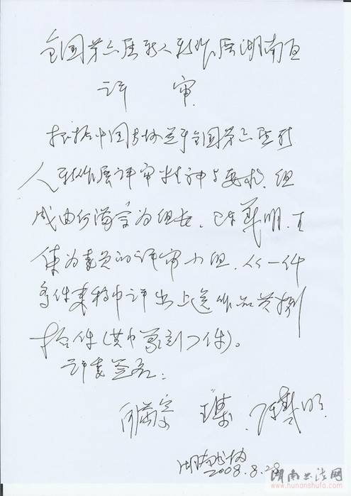 点,全国第六届新人新作展湖南区评审在湖南省文联多功能会议厅进行。湖南省文联副主席、省书协主席何满宗,副主席陈羲明、王集参加了评审。此次共收到全省投稿作品一千多件,评出上送作品共80件,其中篆刻七件。