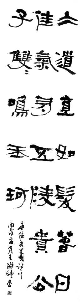 在这么个家庭和当时社会大环境的影响下,他对书法产生兴趣是很自然的。以后他考取洛阳师专美术系,受到书坛名家薛玉印先生的悉心指导,书法技艺逐步提高,23岁时作品就获得河南省大学生书法大赛一等奖。这项荣誉的取得,使他觉得于书画自己尚有几分天资,更坚定了学书法的决心。大学毕业后,他到市财校教书法,使他更有时间习书,他如鱼得水,像入魔一般。不论是三九严冬,还是三伏酷暑,他都坐在屋内练字读帖,不觉其苦,夜以达旦亦经常有之;出差旅游,每到一处,见到好牌匾或碑碣,往往流连忘返,心追手摹;买工具书时,尽管囊中羞涩,也要想方设法买来;每逢书展赛事,总是争先恐后前去观摩学习。 我们知道,一位成功的书法家必备三个条件,对自身而言,一要悟性高,二要刻苦学习;另一个是外因,就是要找一位好老师引正道、指迷津、解惑答疑。 鸿斌是幸运的,他拜别玉印先生,走出大学校园,进入社会后,就想博众家之长。他默默地寻觅着,把目光瞄准社会上许多书法家,最后找到王鸣先生,就“立雪王门”。在王鸣老师的指导下,他的书艺日臻成熟。他遍临秦汉、晋唐、宋清诸多名帖,尤其在二王、米芾、苏轼、王铎和近代吴昌硕先生等名作上用功颇勤,同时在汉碑《西狭颂》、《张迁碑》、《石门颂》、汉代简书上下了很多工夫,在深入临帖过程中,悟得古人妙法,取精用弘,书艺大进,目前他已是我市最年轻的中国书法家协会会员。 从其作品来看,他这么多年的工夫没有白费,他对毛笔的驾驭能力已达到非常熟练的地步,轻重缓急、枯涩浓淡、谋篇布局都控制有度。打个比喻来说,他已能够戴着镣铐跳舞,舞跳得姿态婀娜、优美动人哩!不然,大展入选率咋恁高呢。 鸿斌决不把书法看成是单纯的笔墨技巧,而是把书法学习与读书结合起来,从我国传统文化层面去把握、理解、研习和展示,所以他研究书法理论,学习其他美术、音乐、文史哲诸学科,不敢有所懈怠,偶有闲空便展纸练字,用以加深对书法艺术的理解。好的作品要写出神采,这个神采正是作者较高艺术造诣、精神气质和文化素养在作品中的综合反映,是来不得半点虚假的。 鸿斌有对书法之痴迷,有良师的关爱,有较好的传统基本功,更为难得的是有较高的悟性,三十出头就取得如此可喜成绩,值得我侪高兴并向他学习。如果今后注意戒躁戒傲,进一步加强学养深修,使作品精益求精,就更加喜人,那才是我们所期望的。