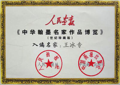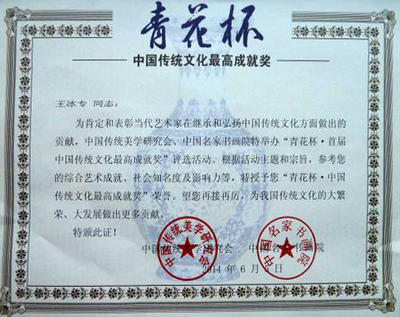 获传统文化最高成就奖证书今日翰墨中国书画大赛金奖全国中老年书画大展金奖入当代书画传承人物作品集证书入选证书20160-01首届幽兰赋杯全国书画展金奖证书授予“中华金奖艺术名家”称号奖杯授予全国百位优秀人民艺术家证书王冰专被聘英国皇家艺术基金会顾问王冰专被评为书坛百杰证书