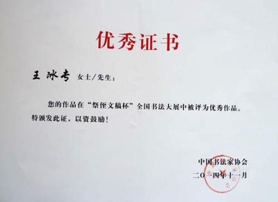 王冰专获全国祭侄文稿杯书法优秀(最高)获王冰专捐赠书法拍卖救助贫困儿童证书王冰专书法被韩国艺术交流中心收藏王冰专书法赴日展获银奖王冰专书法韩国展出王冰专书法获金奖王冰专书法获省一等奖王冰专书法获中新杯优秀奖王冰专书法入编《传世书画鉴赏》王冰专书法入编大型画册