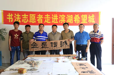 书法志愿者走进昌图滨湖希望城6月6日,书法志愿者来到昌图滨湖希望城,受到员工的欢迎。滨湖希望城董事长总经理(中)王德武副总经理(右二)李振财愿者合影滨湖希望城董事长总经理王德武向书法志愿者介绍说:“我们滨湖希望城的建设,完全是高标准的,无论是工程质量;还是物业管理都要创第一,成为昌图最好的住宅区;下
