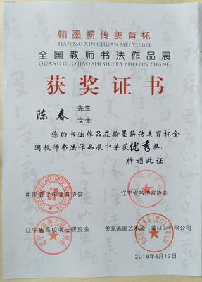 陈春书法获美育杯全国教师书法大赛优秀奖。