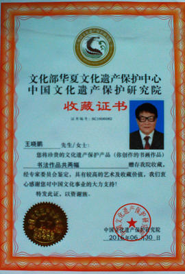 著名书法家王晓鹏先生资质证书