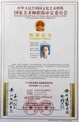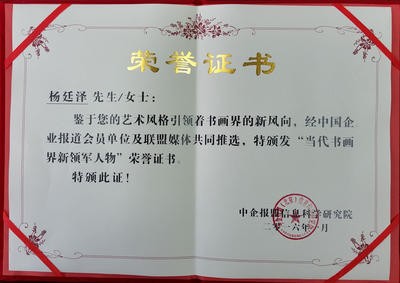 中企报盟信息科学研究院2016年1月为杨廷泽颁发“当代书画界新领军人物”证书。