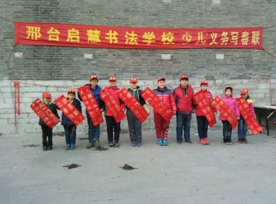 启慧书校上街义务写春联中国楷书世家-中国四代楷书世家-启慧书法学校在2016年猴年春节即将来临之际,组织本学校18名少儿书写者为邢台市父老乡亲免费书写春联。18名少儿书写者来自全市中小学,在启慧书法学校经过一至三期勤奋而刻苦的毛笔楷书学习。为了弘扬中国毛笔楷书技艺和继承启慧书法学校26年来义务写春联