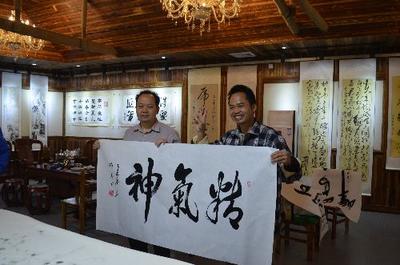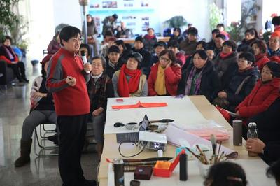 1月23日,冒着严寒来到北京宋庄,为尚善艺术中心失独家庭举办“楹联艺术”讲座,挥毫作书并发奖品。